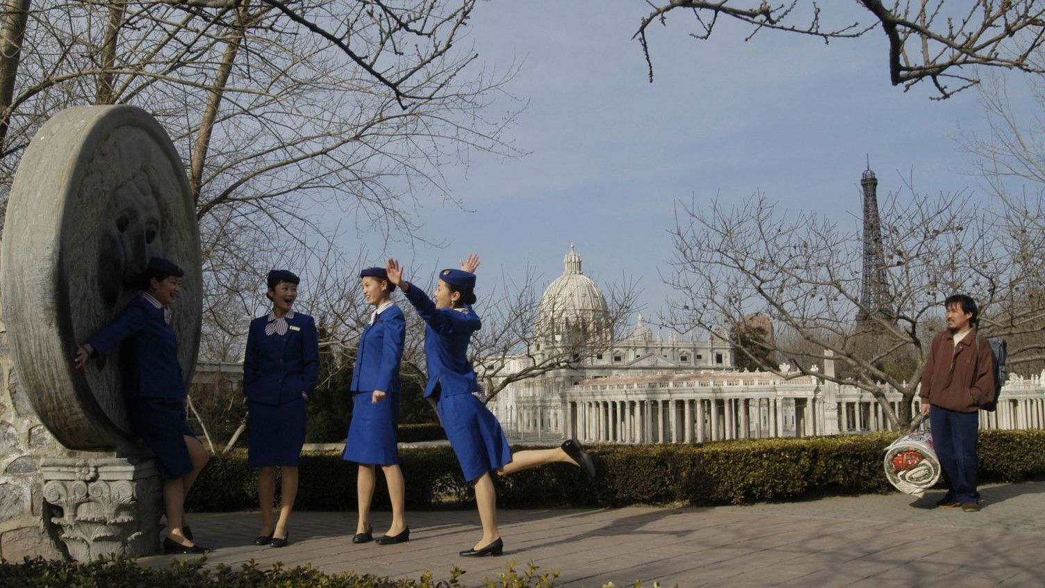 At Beijing World Park, a bizarre cross-pollination of Las Vegas and Epcot Center where visitors can interact with famous international monuments without ever leaving the city’s suburbs, a security guard betrays his dancer girlfriend by pursuing another woman.