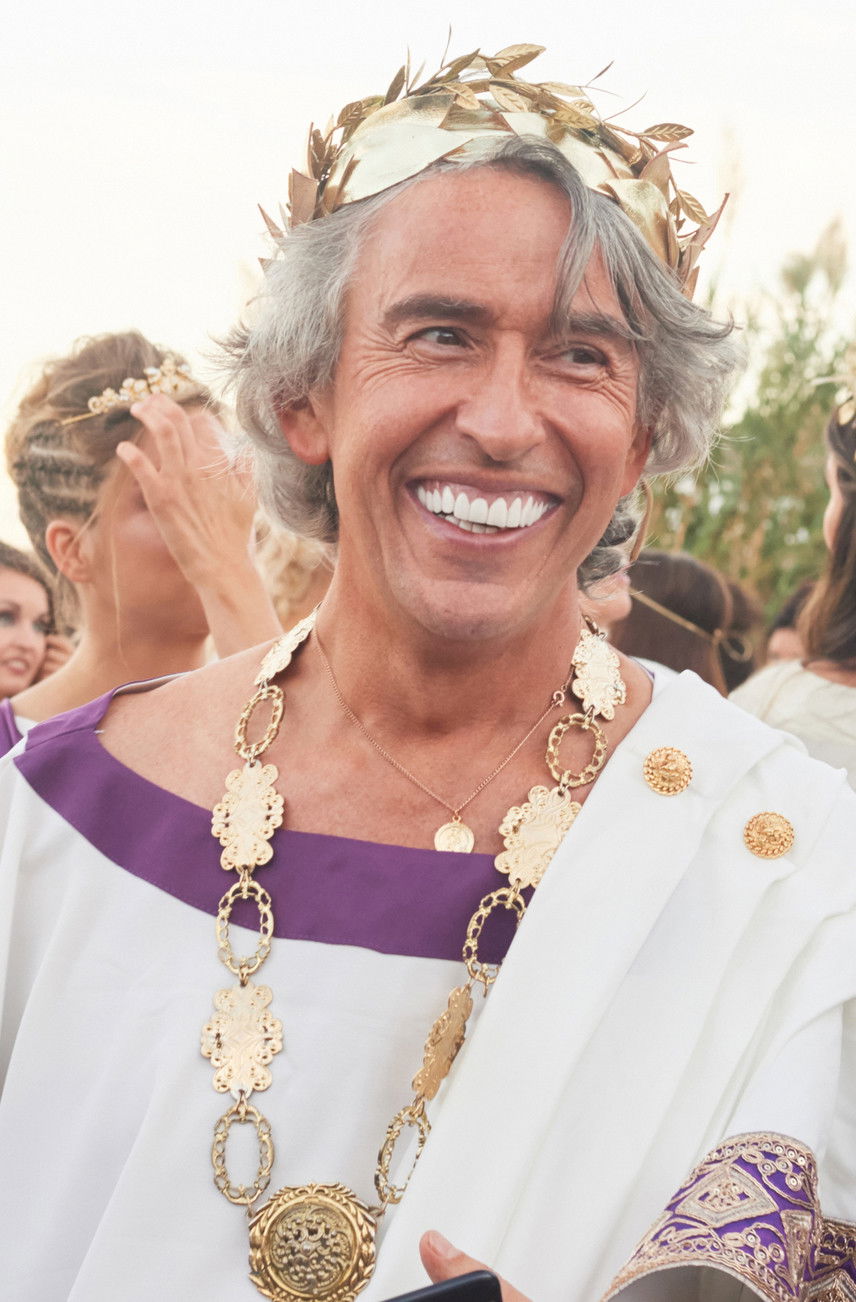 Sir Richard McCreadie (Winterbottom's regular leading-man Steve Coogan in full-Steve Coogan mode) is one of Britain's richest men, and in possession of Britain's whitest teeth. The perma-tanned "self-made" billionaire is the owner of several thriving clothing chains and is known as "the King of the High Street", although a less complimentary nickname is "Greedy" McCreadie. The non-linear narrative depicts three main events in McCreadie's life. We see his rise to power, when, as a young man (played by a wonderfully loathsome Jamie Blackley), he opens multiple businesses (all of which fail) as he learns the ins and outs of asset-stripping, the importance of using foreign sweatshops, and how to exploit realty and tax practices without breaking the law. In the modern-day, we see him hauled before a Parliamentary Select Committee convened to investigate the bankruptcy of one of his chains. And, in the film's present, on the Greek island of Mykonos, the final (chaotic) touches are being put to McCreadie's Roman-themed 60th birthday bash – complete with mandatory togas, a fake coliseum, and a real, albeit somnolent, lion (McCreadie is obsessed with Ridley Scott's _Gladiator_ – and yes, the fact that there were tigers rather than lions in that movie is brought up several times). The party is scheduled to take place in a couple of days, or at least it will if the underpaid Bulgarian workers will ever finish the coliseum, the optically-unappealing Syrian refugees will ever leave the nearby public beach, and the litany of celebrities who promised to swing by will ever stop cancelling.